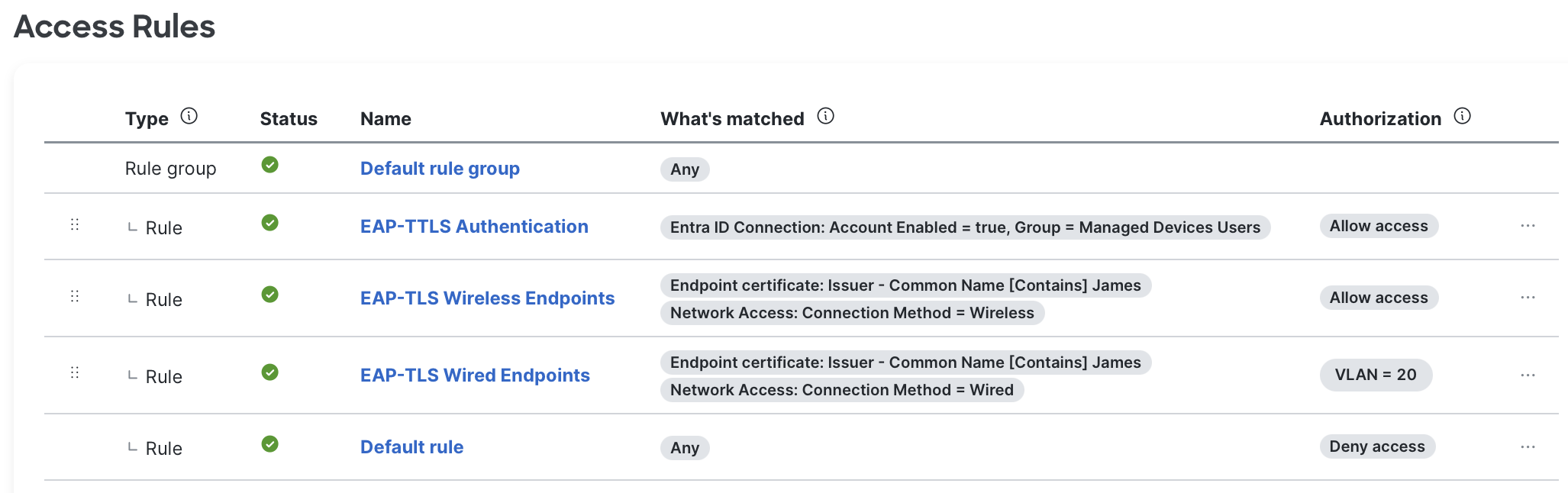 EAP-TLS is really quite simple, you just need to upload the root CA and mark it as trusted. Your devices then just need to trust the Meraki EAP certificate. Within Meraki, each network has its own EAP certificate and the organisation has its own wildcard which makes this significantly more flexible and secure. You should deploy certificates and a dot1X profile via MDM. Via MDM, clients need to be configured to trust your Meraki’s public CA certificate and your network’s CN. The Access Rules in Access Manager then allow you to apply access based on a variety of attributes.